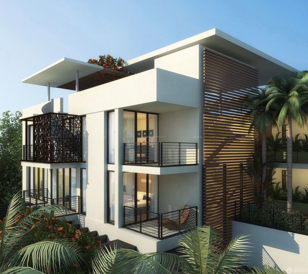 3、材质与色彩的巧妙搭配:现代别墅外观设计注重材质与色彩的搭配,运用现代建筑材料如玻璃、金属、石材等,结合时尚的色彩组合,营造出独特的视觉效果。